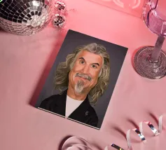 Caricatura umoristica del noto cabarettista, musicista, presentatore, attore e artista scozzese Billy Connolly. Una delle caricature realizzate per la serie Celebrity Sunday, in cui un personaggio famoso viene ritratto in un giorno. L'idea è di mostrarli come in una fototessera per avere coerenza.