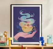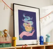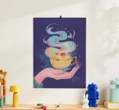 Questa opera d'arte mostra una mano che tiene in mano una tazza da tè gialla con vapore vorticoso. Lo sfondo è scuro con elementi mistici, che creano un senso di incanto e mistero.