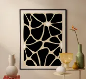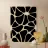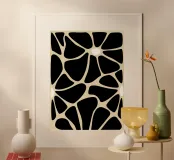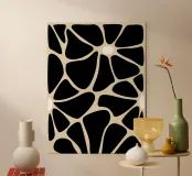 Un motivo di forme nere irregolari è collegato tra loro come un mosaico o una stampa animale astratta. Piccoli ovali bianchi sono distribuiti tra le forme, aggiungendo contrasto e interesse al disegno.