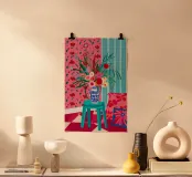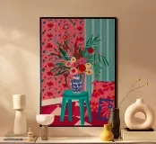 Una colorata natura morta con un bouquet di fiori in un vaso blu a fantasia, posto su un tavolo turchese brillante. La sedia rossa e lo sfondo a motivi aggiungono un'energia eclettica, gioiosa e vibrante all'opera.