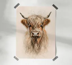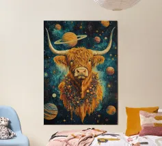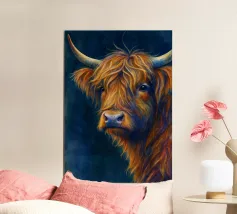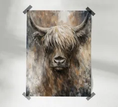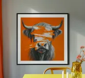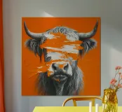 Dieses ausdrucksstarke Kunstwerk zeigt den Kopf eines Stiers in fotorealistischer Detailtreue – teilweise übermalt mit kraftvollen, groben Pinselstrichen in Orange und Weiß. Der kontrastreiche Hintergrund und die dynamische Farbfläche über den Augen schaffen Spannung zwischen Naturdarstellung und abstrakter Expression. Perfekt für moderne Interiors mit Statement-Charakter.
