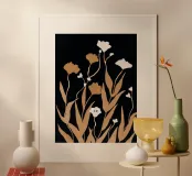 Un'audace composizione botanica in cui caldi steli ocra e morbidi fiori bianchi emergono su uno sfondo nero profondo. Il gioco di luci e ombre di questo pezzo minimale conferisce un senso di tranquilla eleganza, perfetto per gli stili di interni contemporanei, monocromatici o lunatici.
