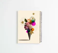 Stravagante arte del collage con un bouquet di rose, peonie e stelle glitterate dorate. Un tocco gioioso e surreale di design a tema floreale e alimentare.