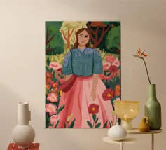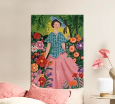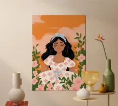Questa opera d'arte raffigura una persona con un vestito ricoperto di grandi fiori colorati. Lo sfondo è blu con nuvole bianche e la persona si trova in mezzo a un campo di fiori, simbolo di crescita e bellezza.