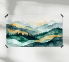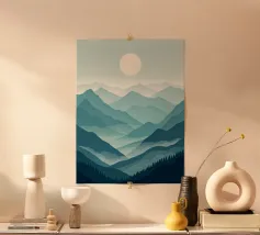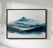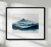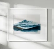 Morbidi strati di creste nebbiose si estendono all'orizzonte in questa scena di montagna minimalista ad acquerello. Con gli indaco profondi, i blu ardesia e la nebbia delicata, l'opera evoca il silenzio, la scala e la solitudine: perfetta per gli interni tranquilli, per l'arredamento delle baite o per gli amanti degli spazi aperti e selvaggi.