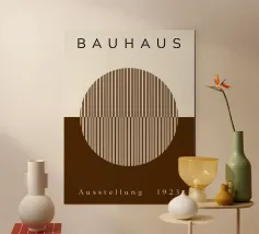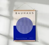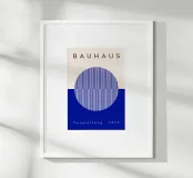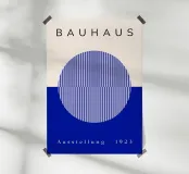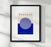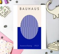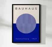 Un poster di ispirazione Bauhaus con un disegno a illusione ottica blu con motivi geometrici a cerchio. Questa moderna opera d'arte astratta unisce precisione, simmetria e colori vivaci per un effetto visivo dinamico. Perfetto per gli interni contemporanei, per gli appassionati d'arte o per chiunque ami il design modernista e la geometria ottica.