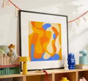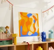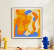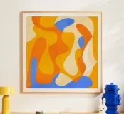 Un'audace stampa astratta moderna con un motivo geometrico arancione e blu. Il contrasto cromatico e le forme pulite creano un design dinamico ed equilibrato, perfetto per gli interni contemporanei. Ideale per aggiungere energia, creatività e stile moderno a qualsiasi spazio abitativo, ufficio o studio. arte astratta arancione e blu, stampa con motivo geometrico, decorazione murale moderna, opera d'arte dai colori decisi, design geometrico minimalista, poster astratto contemporaneo, arte murale vivace, decorazioni arancioni e blu, stampa a contrasto di colore, arte moderna della metà del secolo, decorazione domestica elegante, design moderno del motivo, arte murale geometrica retrò, artista