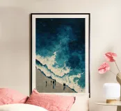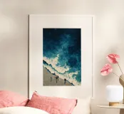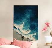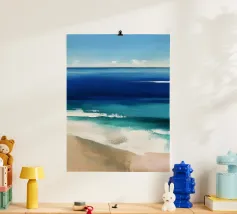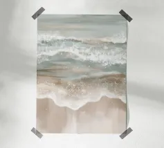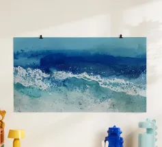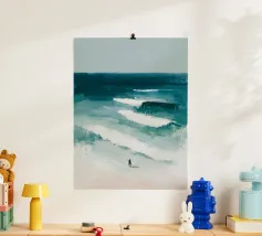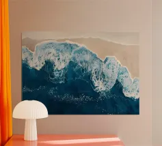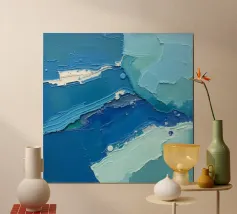 Quest'opera d'arte cattura una potente prospettiva aerea di onde che si infrangono su una costa tranquilla, dipinta con texture dense ed espressive. I blu profondi si dissolvono in toni turchesi più chiari, mentre le onde bianche e spumeggianti formano un confine dinamico tra movimento e immobilità. Piccole figure umane sulla riva enfatizzano la scala e la contemplazione, mettendo a terra la vasta energia del mare. In equilibrio tra astrazione e realismo, la composizione esplora il contrasto, il ritmo e l'attrazione emotiva dell'oceano, rendendola un'opera di grande impatto per interni moderni e stampe artistiche di grande formato.