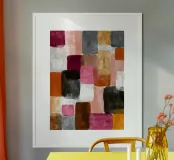 Morbidi quadrati e rettangoli in terracotta, blush e nero creano un moderno ritmo boho. Un pezzo audace ma equilibrato per gli interni contemporanei.