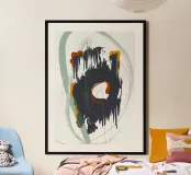 Pennellate audaci e ampie in toni scuri e tenui sono accentuate da linee fluide verdi e arancioni. Un vuoto centrale è circondato da colori stratificati, creando un senso dinamico di movimento.
