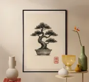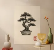 Bonsai in una ciotola giapponese in stile Sumi-e poster