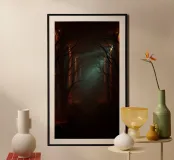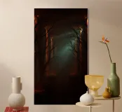 Una foresta scura con alberi spogli crea un'atmosfera inquietante, mentre una nebbia soffice si intreccia con luci incandescenti, offrendo un design di sfondo astratto e accattivante per dispositivi mobili.