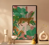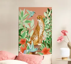 Jungle illustration with a panther, surrounded by versatile and multicolored plants. Beautiful colors for a cheerful nursery or baby's room, or the kids corner in the house.