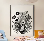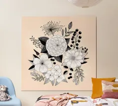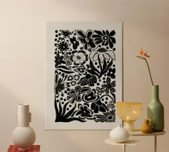 Una composizione botanica in bianco e nero presenta un assortimento di fiori selvatici e fogliame intricato e intrecciato. La composizione cattura varie forme e dimensioni, creando un ricco arazzo di elementi floreali.