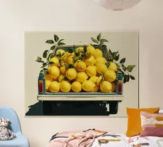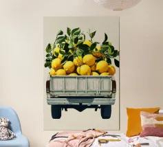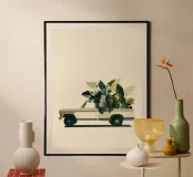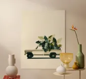 Un'illustrazione minimalista e contemporanea di un camioncino vintage di profilo, che trasporta un carico abbondante di fogliame verde lussureggiante. Lo sfondo color crema tenue e le texture morbide e pittoriche creano un'atmosfera calma e ariosa, mentre le foglie stratificate introducono ritmo e movimento organico. Il contrasto tra il veicolo solido e le piante vive suggerisce un equilibrio tra natura e viaggio, rendendo quest'opera d'arte un accento raffinato per interni moderni, scandinavi o di ispirazione ecologica che privilegiano una narrazione tranquilla e un design pulito.