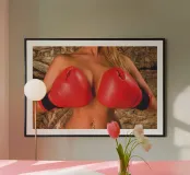 Una giovane donna che si copre il seno con guanti da boxe rossi