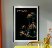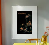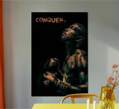Il poster presenta un potente primo piano di un pugile, il cui corpo brilla di sudore e determinazione. L'illuminazione drammatica nei toni profondi dell'arancione e del nero crea un effetto audace, quasi cinematografico, sottolineando la forza e la perseveranza del pugile. La parola "CONQUER." in una tipografia robusta e schizzata rafforza il messaggio fondamentale: il successo inizia con la convinzione.