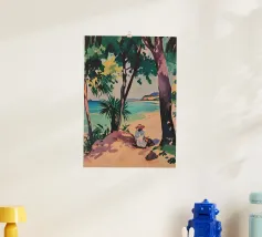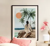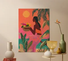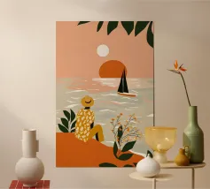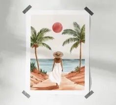 Grazioso dipinto digitale di una donna sicura di sé in una fluente vestaglia bianca seduta su una spiaggia rocciosa con palme e un vibrante sole arancione. Questa elegante e serena scena costiera evoca lusso, calma e vibrazioni tropicali. Perfetto per gli amanti della moda, dell'arte moderna e dell'arredamento tropicale. Aggiunge raffinatezza e calore a soggiorni, camere da letto e uffici. Regalo ideale per i collezionisti d'arte e gli appassionati di ritratti contemporanei ispirati alla spiaggia.