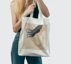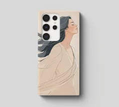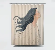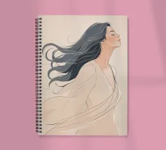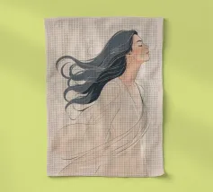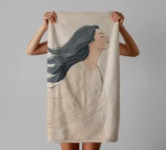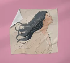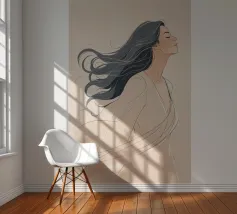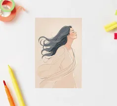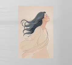 Un momento sereno catturato in movimento: una donna con gli occhi chiusi che abbraccia la calma di una leggera brezza. Linee morbide e toni ariosi creano una sensazione di pace e di tranquilla introspezione.