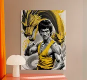 Stampa artistica di alta qualità con cornice in legno, ritraente Bruce Lee in stile retrò con draghi gialli. Perfetta per arredare soggiorni, camere da letto o spazi dedicati alle arti marziali. Ideale come regalo per appassionati di cinema, arti marziali e cultura pop orientale.