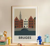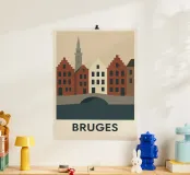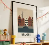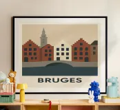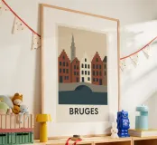 Case a graticcio, ponti in pietra e campanili medievali si fondono in una composizione calda e ordinata. Questo poster cattura l'essenza poetica di Bruges, città d'arte e di silenzio, perfetta per gli amanti dell'estetica fiamminga e del fascino senza tempo.