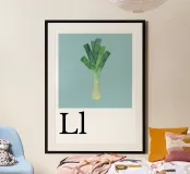 Sottile, verde e pieno di sapore: il porro porta la "L" in questa serie di poster. Un moderno richiamo visivo per cucine e aule scolastiche.