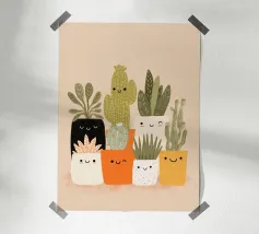 Questo allegro poster presenta simpatiche piante di cactus in piena fioritura, su uno sfondo rosa tenue che ne esalta il fascino giocoso e femminile. I fiori luminosi e le forme arrotondate creano una composizione allegra e spensierata, con un'atmosfera calda ed edificante. L'estetica dolce e moderna lo rende particolarmente adatto a camere da letto, nursery, uffici domestici e spazi creativi, aggiungendo un tocco di gioia, colore e stile botanico.