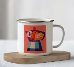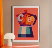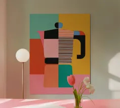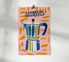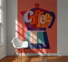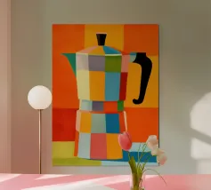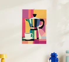 Porta un tocco di vivacità nella tua cucina con questo poster d'arte stilizzato che celebra il caffè. Perfetto per gli amanti della caffeina e come decorazione murale per rendere l'ambiente più accogliente e colorato.