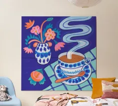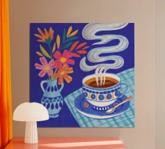 Illustrazione stravagante di una tazza di caffè fumante in una tazza a scacchi blu e bianchi, con fiori stilizzati che fluttuano sopra di essa, su uno sfondo blu scuro e ondulato.