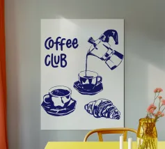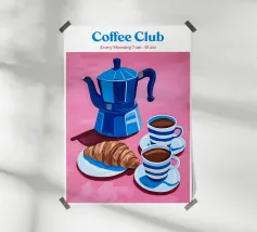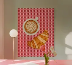 Un'accogliente illustrazione digitale in stile pittorico, che mostra una calda tazza di caffè con un croissant al burro.