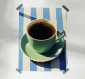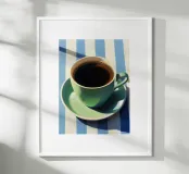 Illustrazione luminosa di una tazza di caffè nero su un piattino verde, con una tovaglia a righe bianche e blu sullo sfondo. Un poster elegante e rinfrescante, ideale per una cucina, un angolo caffè o un ambiente mediterraneo.