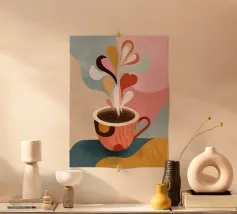 A playful scene of a swimmer in a black and white striped suit diving into an oversized blush coffee cup. Soft pink sky, cheerful daisies, and sunny citrus shapes add fresh morning energy. Minimal shapes and candy colors create a modern, whimsical vibe that feels like the first sip of the day.