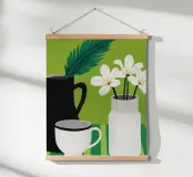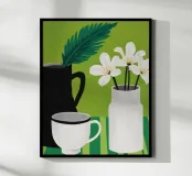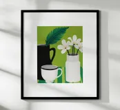 Una natura morta minimalista in bianco e nero con una brocca nera, una tazza bianca e un semplice vaso bianco con tre fiori bianchi.