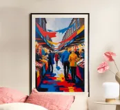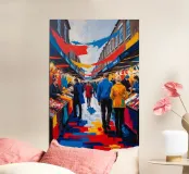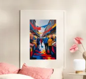 Questo dipinto raffigura la vivace energia del Camden Market con una tavolozza vibrante di rossi, blu e gialli. Le pennellate espressive creano un'atmosfera dinamica, enfatizzando le vivaci bancarelle del mercato e l'eclettico mix di visitatori. L'opera celebra la diversità culturale e lo spirito creativo di Camden, offrendo una vivida interpretazione di una delle destinazioni più iconiche di Londra.
