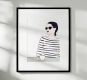 Illustrazione minimalista di una persona che indossa una camicia a righe e tiene in mano una tazza di caffè. Lo stile è pulito e moderno, con un'attenzione particolare alle linee semplici e al momento del caffè.