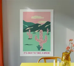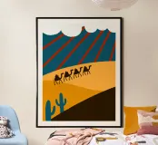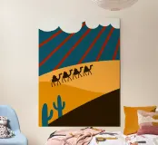 Portate l'atmosfera esotica e rilassante del deserto nella vostra casa con Camels and Cacti, un'affascinante illustrazione con cammelli e cactus in mezzo a un bellissimo paesaggio desertico.