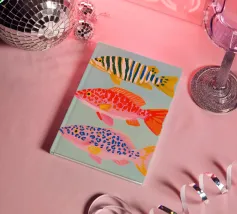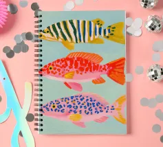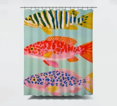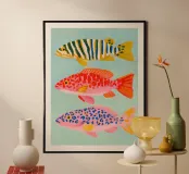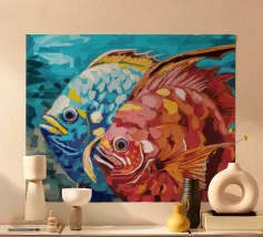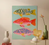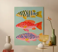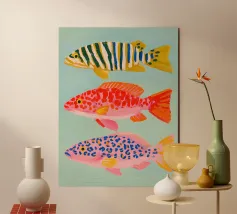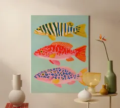 Una gioiosa composizione dipinta di pesci colorati dai toni vivaci e giocosi. Quest'opera d'arte aggiunge un'allegra atmosfera costiera a qualsiasi spazio.