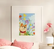 cane fiori nuvole cielo blu erba collare rosso campo giornata di sole primavera all'aperto natura fiori gialli fiori viola fiori arancioni steli verdi modello floreale animale domestico animale paesaggio colori vivaci