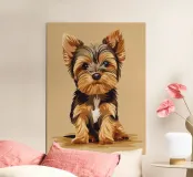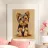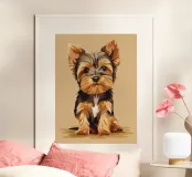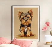 Cane carino di piccola taglia seduto con un'espressione giocosa in un ambiente accogliente poster con telaio in legno