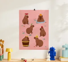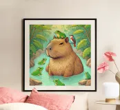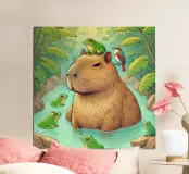 Un capibara si rilassava in una sorgente calda, circondato da uccellini appollaiati sulla testa e rane che saltellavano sulle zampe.