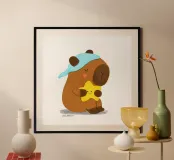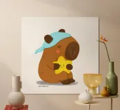 Simpatico disegno di capibara che indossa un cappello per dormire e abbraccia un cuscino a forma di stella. Sogni d'oro, piccolo capibara.