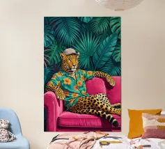 Illustrazione stilizzata di un carismatico ghepardo vestito in modo casual chic con occhiali da sole eleganti e una posa da dandy sicuro di sé. Con la sua tavolozza vibrante e il suo tocco favoloso, quest'opera d'arte celebra l'individualità, lo stile e la fiducia in se stessi. Perfetto se amate le vibrazioni della fauna tropicale con uno spirito moderno.