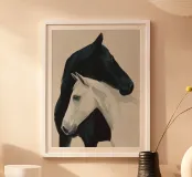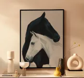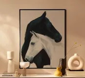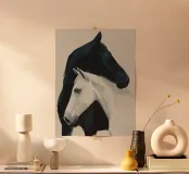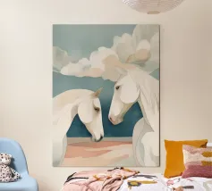 Un semplice dipinto raffigurante due cavalli che condividono un momento di calma e tranquillità.