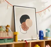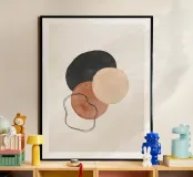 Aggiungete un tocco di fascino minimalista al vostro spazio con questa vibrante stampa d'arte astratta moderna di metà secolo, caratterizzata da un'ipnotica miscela di forme geometriche e fluide di acquerello su uno sfondo neutro morbido e cremoso. Con la sua calda atmosfera scandinavo-giapponese, non è solo arte: è un'atmosfera.