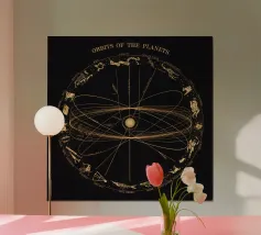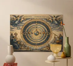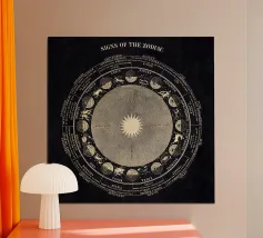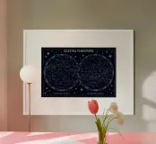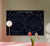 An elegant celestial planisphere illustrating the night sky of both hemispheres. Delicately drawn constellations, seasonal months, and star patterns create a timeless astronomical artwork. Perfect for modern interiors, science lovers, and minimalist spaces seeking a refined cosmic atmosphere with educational charm and visual balance.