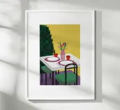 Una scena d'interni semplice e moderna di un tavolo apparecchiato per due, con un vaso di fiori come centrotavola. La parete gialla e l'ambiente minimalista creano un'atmosfera di tranquilla intimità e semplicità chic.