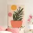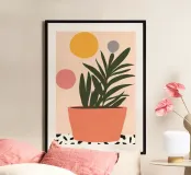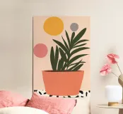 Una pianta in vaso con forme circolari astratte sullo sfondo.