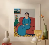 Un ritratto semplice ed elegante di una donna in abito blu, seduta su una sedia su uno sfondo giallo caldo. La sua espressione calma ed equilibrata crea un senso di tranquilla sicurezza e di grazia senza tempo.