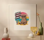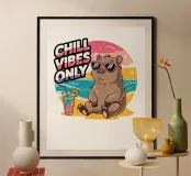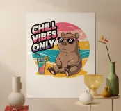 Un capibara rilassato con gli occhiali da sole si sdraia su una spiaggia con un drink tropicale e un vibrante tramonto sullo sfondo. La frase "Chill Vibes Only" è ben visibile accanto al capibara.