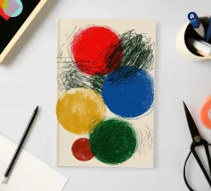 Un vivace studio astratto di forme circolari sovrapposte rese con tonalità primarie saturate. Una sfera rosso acceso, blu intenso, giallo caldo e verde intenso interagiscono sulla superficie, intersecandosi parzialmente e sovrapponendosi a energici tratti scarabocchiati. L'applicazione materica conferisce a ciascuna forma una qualità tattile, quasi gessosa. Tratti neri e verdi sciolti ed espressivi attraversano la composizione, introducendo attrito e movimento contro la morbida curvatura dei cerchi. L'equilibrio tra le masse di colore solido e i segni lineari irrequieti crea un senso di tensione, ritmo e impatto visivo, c